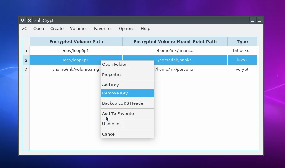 - 统一管理现有加密卷: 如果您同时使用 LUKS、VeraCrypt 或需要访问 BitLocker 加密的驱动器,zuluCrypt 提供了一个集中的管理界面,无需在多个工具间切换。
